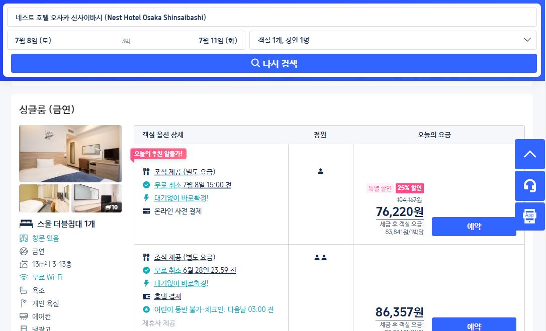 위에서 공유 드린 인터넷 캐시의 문제도 있지만 실시간으로 사이트별로 예약 가격이 변동이 되더라구요.